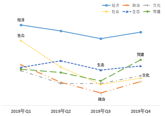 從領(lǐng)域來看,文化、政治領(lǐng)域改革熱度值偏低,黨建領(lǐng)域提升最多。第四季度,經(jīng)濟(jì)領(lǐng)域得分78.41,政治領(lǐng)域得分65.95,文化領(lǐng)域得分67.43,社會領(lǐng)域得分66.82,生態(tài)領(lǐng)域得分69.89,黨建領(lǐng)域得分71.43。