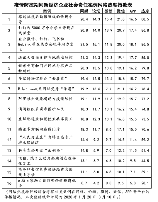 課題組考察在統(tǒng)籌推進(jìn)疫情防控和經(jīng)濟(jì)社會秩序恢復(fù)中表現(xiàn)突出的互聯(lián)網(wǎng)平臺案例,根據(jù)其對經(jīng)濟(jì)社會生活的實(shí)際影響,以及公眾對相關(guān)服務(wù)的關(guān)注度和美譽(yù)度,由長期研究互聯(lián)網(wǎng)新經(jīng)濟(jì)的專家學(xué)者推薦產(chǎn)生“疫情防控期間互聯(lián)網(wǎng)企業(yè)社會責(zé)任案例”。新經(jīng)濟(jì)是一個開放的賽道,在服務(wù)公眾的賽道上應(yīng)鼓勵萬馬奔騰。本次案例推薦不僅重視BAT等超級平臺,也適當(dāng)選入一些中小微互聯(lián)網(wǎng)企業(yè),點(diǎn)贊其服務(wù)經(jīng)濟(jì)民生的創(chuàng)新嘗試。