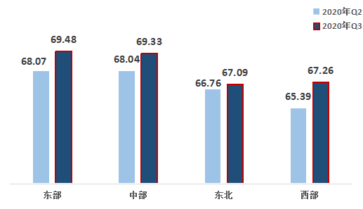 2、從四大區(qū)域來看,東部、中部、東北、西部的改革熱度指數(shù)分別為69.48,69.33,67.09,67.26。熱度指數(shù)呈現(xiàn)地域特征,東部地區(qū)最高,中部次之,西部地區(qū)延續(xù)前兩個(gè)季度趨勢(shì)、繼續(xù)領(lǐng)先于東北地區(qū)。