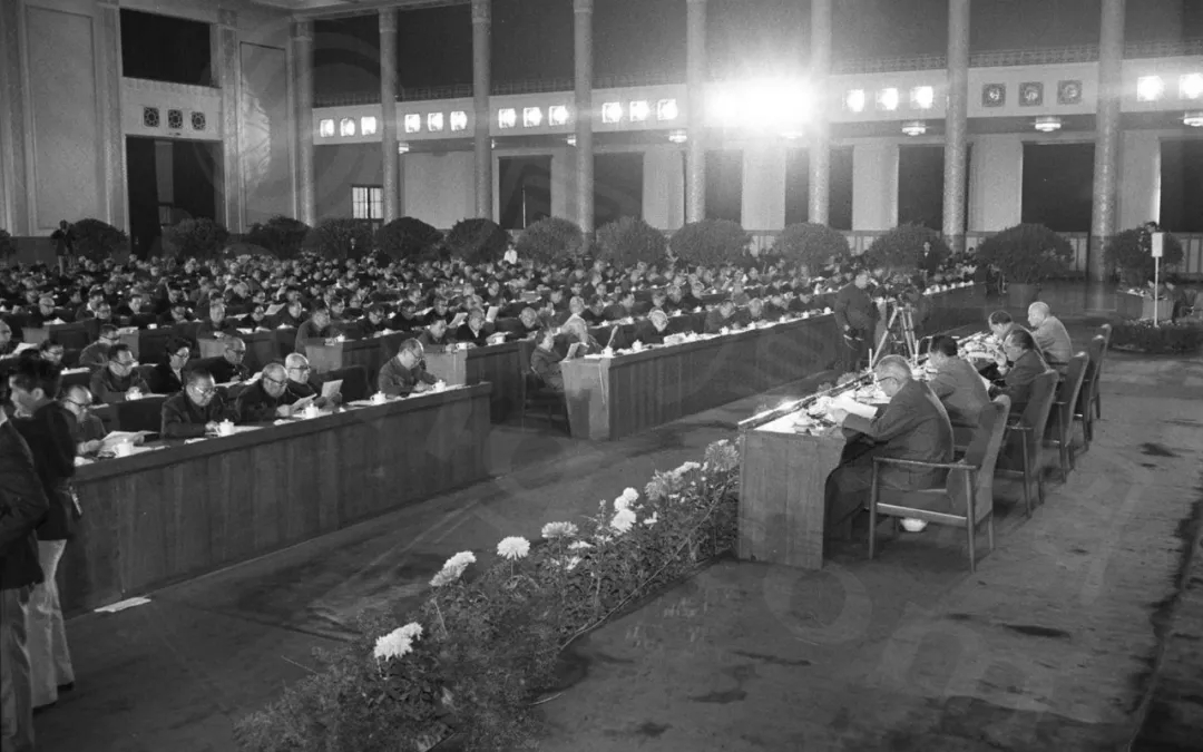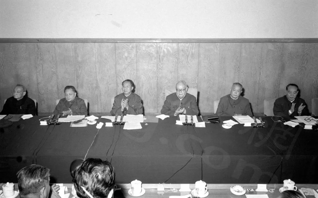 1978年12月18日至22日,中共十一屆三中全會(huì)在北京召開(kāi)。陳云、鄧小平、華國(guó)鋒、葉劍英、李先念、汪東興(自左至右)在十一屆三中全會(huì)上