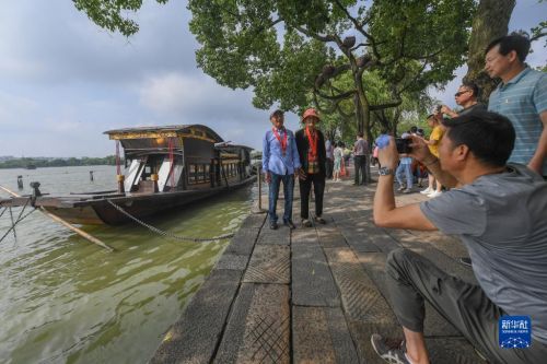 兩名老黨員在浙江嘉興南湖湖心島停泊的南湖紅船旁拍照留影(7月1日攝)。新華社記者 徐昱 攝
