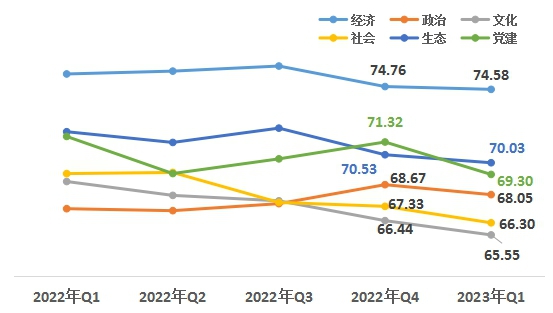 1、經(jīng)濟(jì)、生態(tài)領(lǐng)域小幅下降。從六大領(lǐng)域來看,經(jīng)濟(jì)領(lǐng)域74.58,政治領(lǐng)域68.05,文化領(lǐng)域65.55,社會領(lǐng)域66.30,生態(tài)領(lǐng)域70.03,黨建領(lǐng)域69.30。與上一季度相比,六大領(lǐng)域均有小幅下降;與去年一季度相比,政治領(lǐng)域同比上升,其他領(lǐng)域同比小幅下降。
