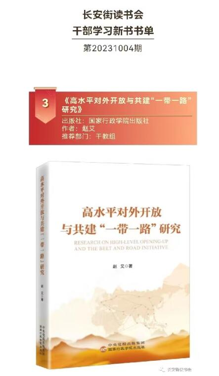 2023年10月18日,在第三屆“一帶一路”國際合作高峰論壇在北京隆重舉辦之際,長(zhǎng)安街讀書會(huì)發(fā)布第20231004期干部學(xué)習(xí)新書書單,我會(huì)常務(wù)副會(huì)長(zhǎng)兼秘書長(zhǎng)趙艾新著《高水平對(duì)外開放與共建“一帶一路”研究》名列推薦榜單。
