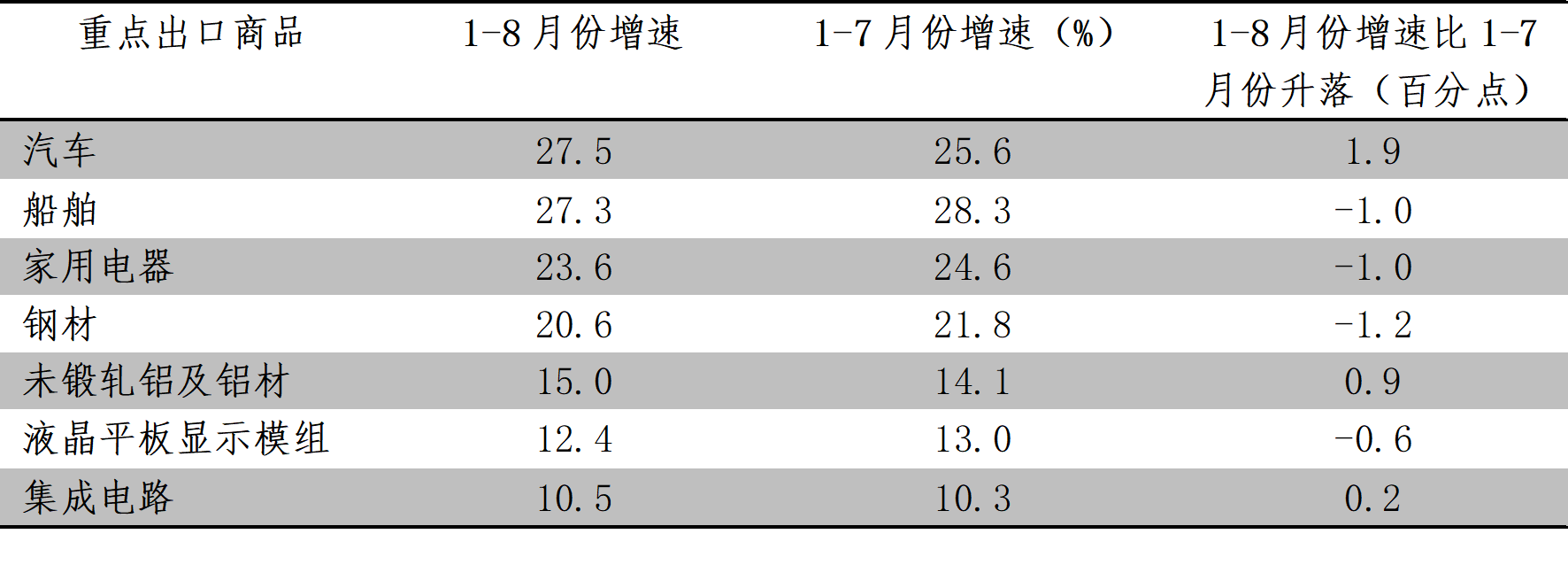 1-8月份,累計(jì)出口數(shù)量增長(zhǎng)速度超過(guò)10%的重點(diǎn)商品共有7類,與1-7月份持平,其中3類增速回升,4類增速回落,即汽車出口增長(zhǎng)27.5%,船舶出口增長(zhǎng)27.3%,家用電器出口增長(zhǎng)23.6%,鋼材出口增長(zhǎng)20.6%,未鍛軋鋁及鋁材出口增長(zhǎng)15.0%,液晶平板顯示模組出口增長(zhǎng)12.4%,集成電路出口增長(zhǎng)10.5%。