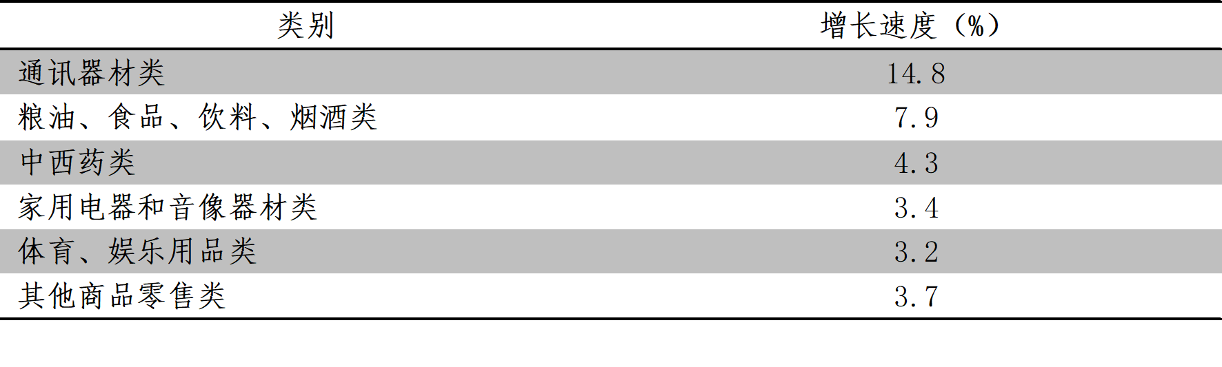 8月份,限額以上單位商品零售額增速快于消費(fèi)品零售總額2.1%增速的共有6類,即通訊器材類同比增長(zhǎng)14.8%,糧油、食品、飲料、煙酒類增長(zhǎng)7.9%,中西藥類增長(zhǎng)4.3%,家用電器和音響汽車類增長(zhǎng)3.4%,體育、娛樂用品類增長(zhǎng)3.2%,其他商品零售類增長(zhǎng)3.7%。