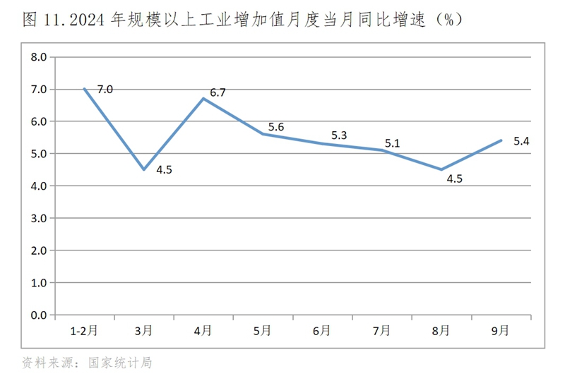 (一)工業(yè)生產(chǎn)增速基本上持續(xù)回落,9月份回升。規(guī)模以上工業(yè)增加值增速年初開(kāi)局走高,1-2月份同比增長(zhǎng)7.0%,3月份增速回落,4月份增速回升,但自此以后持續(xù)走低,到8月份增速為4.5%,9月份增速呈現(xiàn)回升,同比增長(zhǎng)5.4%。