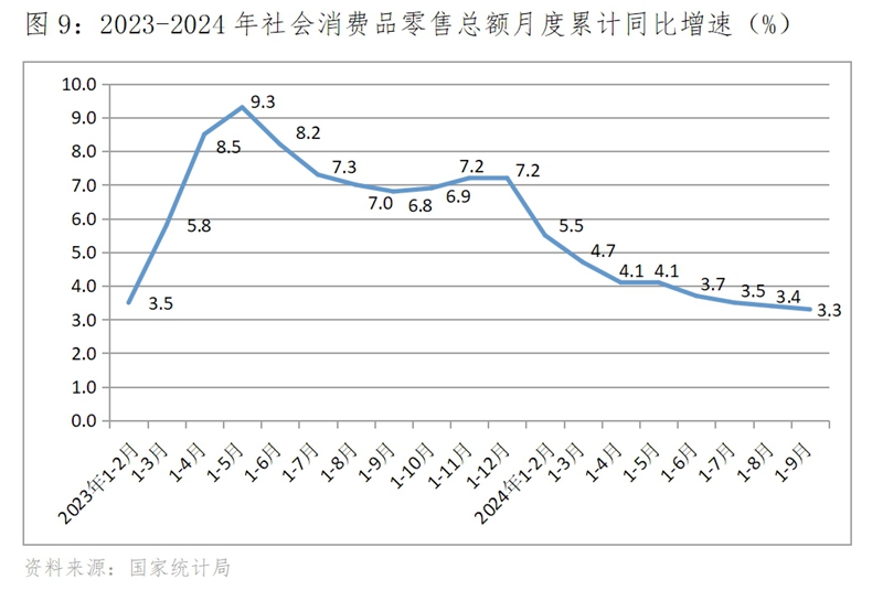 (三)零售增速總體呈現(xiàn)低速波動(dòng)回落,9月份回升。1-2月份社會(huì)消費(fèi)品零售總額同比增長(zhǎng)5.5%,為今年以來(lái)的最快增速,3月份回落到增長(zhǎng)3.1%,此后增速在2.0-4.0%區(qū)間內(nèi)低速波動(dòng),9月份增速回升,增長(zhǎng)3.2%。