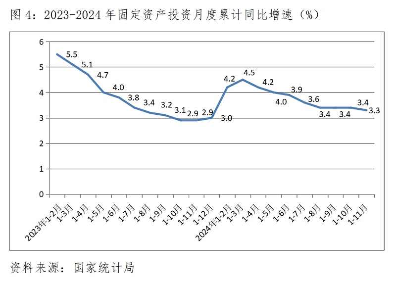 (二)投資增速由持平轉小幅回落。1-11月份,固定資產投資同比增長3.3%,與1-10月份增長3.4%回落0.1個百分點,1-10月份增速與1-9月份持平,投資增速在保持連續(xù)3個月持平后出現了小幅回落。國有控股投資增速略有回落,1-11月份比1-10月份回落0.1個百分點;民間投資降幅略有擴大,1-11月份比1-10月份擴大0.1個百分點。三次產業(yè)投資中,第一產業(yè)投資增速回落0.1個百分點,第二產業(yè)投資增速回落0.2個百分點,第三產業(yè)投資降幅擴大0.1個百分點。