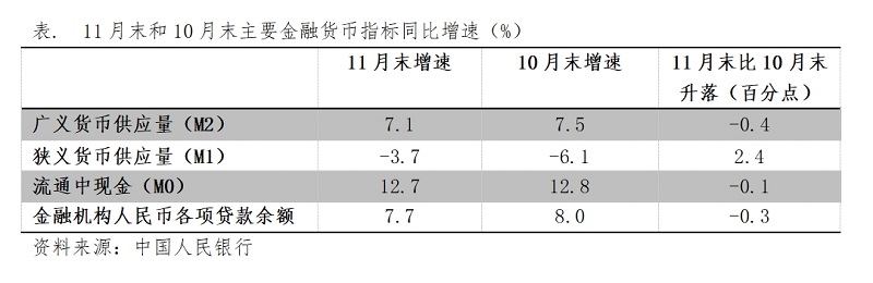 (四)M2增速由升轉落。11月末,廣義貨幣供應量(M2)同比增長7.1%,比10月末增長7.5%回落0.4個百分點,10月末增速比9月末增速回升0.7個百分點;狹義貨幣供應量(M1)降幅繼續(xù)縮小,11月末同比下降3.7%,比10月末同比下降6.1%縮小2.4個百分點,10月末降幅比9月末降幅縮小1.3個百分點;流通中貨幣(M0)增速由升轉落,11月末同比增長12.7%,比10月末增長12.8%回落0.1介百分點,10月末增速比9月末增速回升了1.3個百分點。各層次貨幣供應量又出現了不同方向的變化走勢。