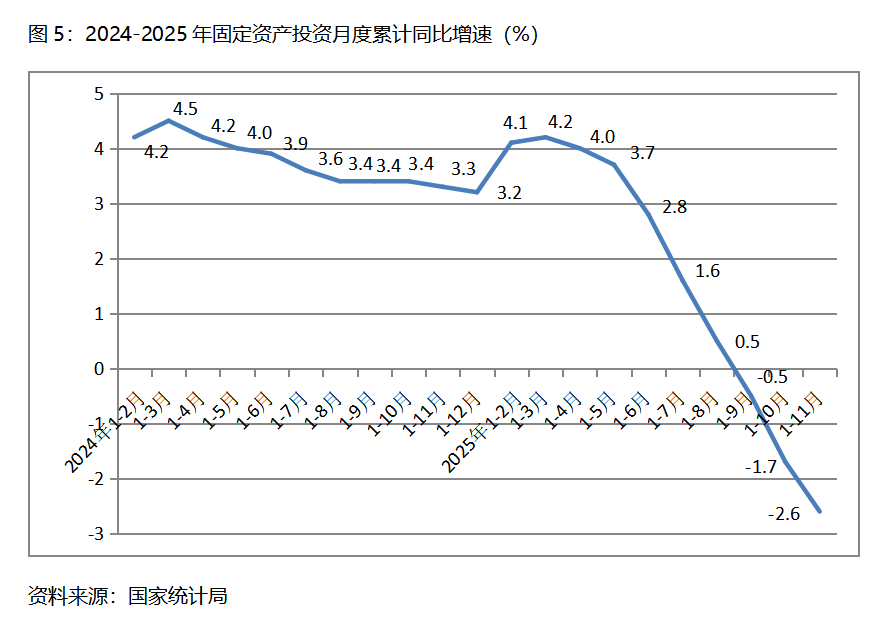 五、投資增速持續(xù)下降。1-11月份,固定資產(chǎn)投資總額同比下降2.6%,比1-10月份下降1.7%擴(kuò)大了0.9個(gè)百分點(diǎn),1-10月份降幅由1-9月份下降0.5%擴(kuò)大了1.2個(gè)百分點(diǎn),其中,1-11月份國(guó)有控股投資同比下降1.1%,1-10月份為增長(zhǎng)0.1%;民間投資下降5.3%,比1-10月份下降4.5%擴(kuò)大了0.8個(gè)百分點(diǎn)。三次產(chǎn)業(yè)投資中,第一產(chǎn)業(yè)投資同比增長(zhǎng)2.7%,比1-10月份增長(zhǎng)2.9%回落0.2個(gè)百分點(diǎn);第二產(chǎn)業(yè)投資增長(zhǎng)3.9%,比1-10月份增長(zhǎng)4.8%回落0.9個(gè)百分點(diǎn);第三產(chǎn)業(yè)投資下降6.3%,比1-10月份下降5.3%擴(kuò)大1.0 百分點(diǎn)。固定資產(chǎn)投資增速數(shù)月的持續(xù)回落乃至下降,也需要引起高度關(guān)注。