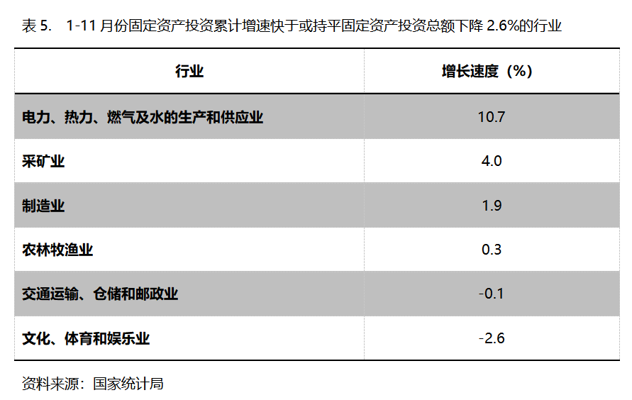 1-11月份,固定資產(chǎn)投資累計(jì)增速快于或持平固定資產(chǎn)投資總額下降2.6%的行業(yè)共6個(gè),即電力、熱力、燃?xì)饧八纳a(chǎn)和供應(yīng)業(yè)增長(zhǎng)10.7%,采礦業(yè)增長(zhǎng)4.0%,制造業(yè)增長(zhǎng)1.9%。農(nóng)林牧漁業(yè)增長(zhǎng)0.3%,交通運(yùn)輸、倉(cāng)儲(chǔ)和郵政業(yè)下降0.1%,文化、體育和娛樂(lè)業(yè)下降2.6%。