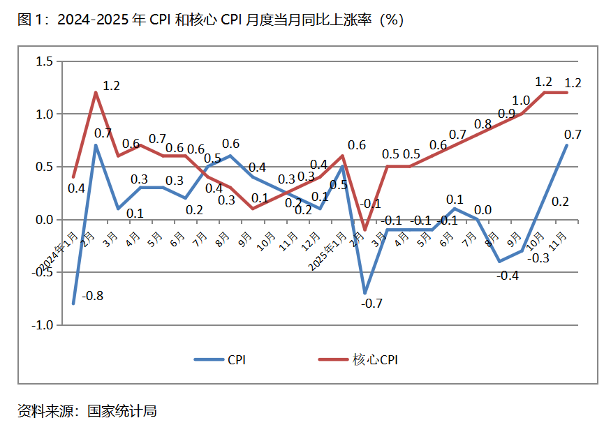 一、CPI漲幅持續(xù)回升。11月份,CPI同比上漲0.7%,比10月份上漲0.2%回升0.5個(gè)百分點(diǎn),10月份由9月份下降0.3%轉(zhuǎn)為上漲;核心CPI同比上漲1.2%,與10月份上漲1.2%持平,10月份比9月份上漲1.0%回升了0.2個(gè)百分點(diǎn)。CPI漲幅回升較為為明顯,核心CPI漲幅保持穩(wěn)定,表明經(jīng)濟(jì)運(yùn)行活力繼續(xù)增強(qiáng),但由于漲幅仍較為有限,加之較長(zhǎng)時(shí)期處于偏低水平,經(jīng)濟(jì)運(yùn)行活力還有待進(jìn)一步提高。