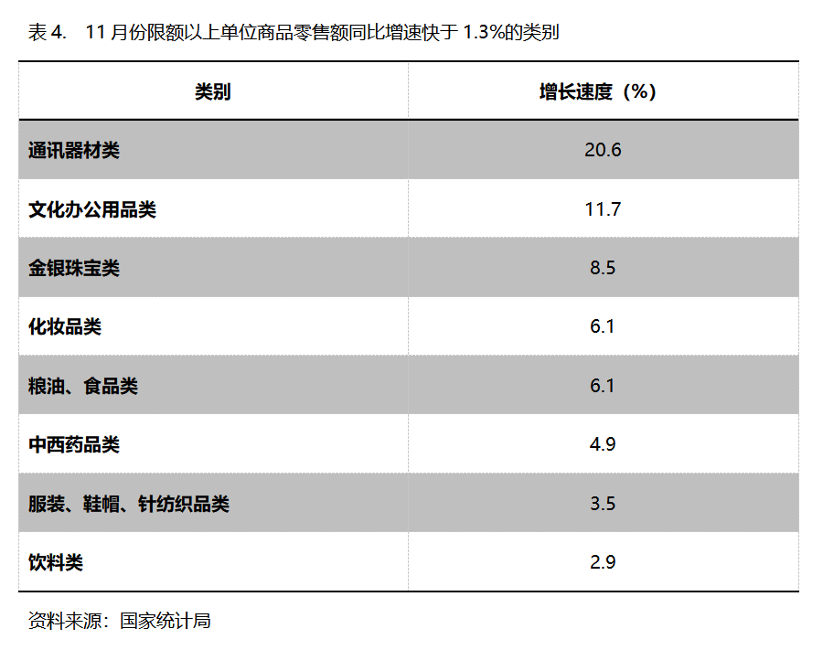 11月份,限額以上單位商品零售額同比增速快于社會(huì)消費(fèi)品零售總額1.3%增速的共有8類,即通訊器材類增長(zhǎng)20.6%,文化辦公用品類增長(zhǎng)11.7%,金銀珠寶類增長(zhǎng)8.5%,化妝品類增長(zhǎng)6.1%,糧油、食品類增長(zhǎng)6.1%,中西藥品類增長(zhǎng)4.9%,服裝、鞋帽、針紡織品類增長(zhǎng)3.5%,飲料類增長(zhǎng)2.9%。
