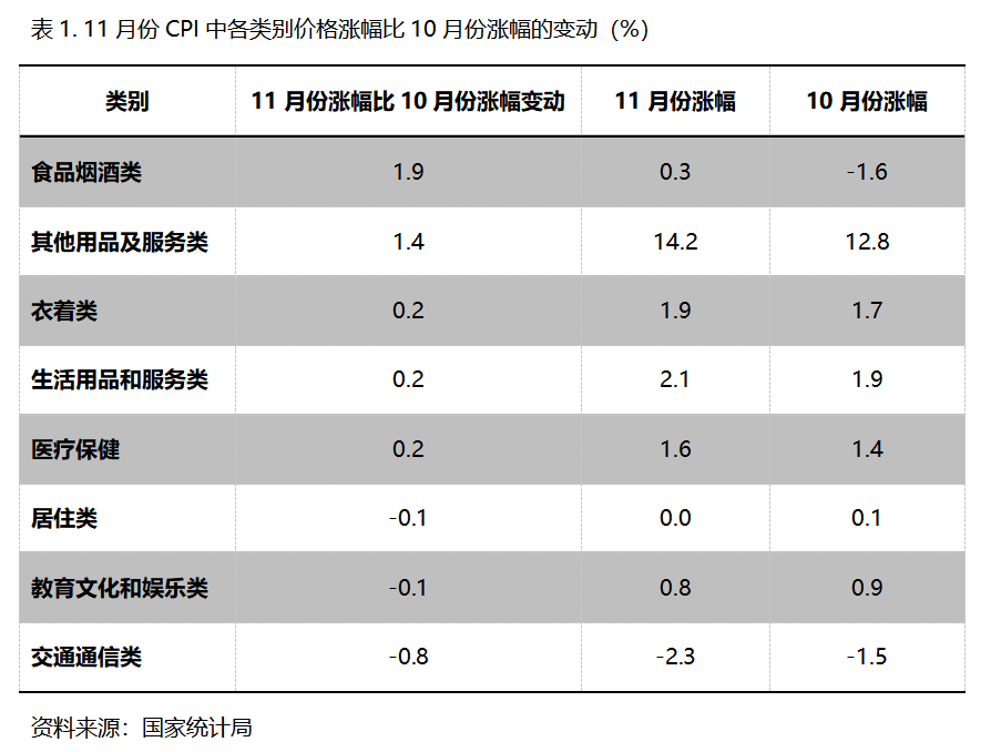 11月份,在CPI 8個(gè)類別中有5個(gè)類別同比漲幅回升,3個(gè)類別回落。漲幅回升的5個(gè)類別包括食品類價(jià)格由降轉(zhuǎn)漲、漲幅回升1.9個(gè)百分點(diǎn),其他用品和服務(wù)類漲幅回升1.4個(gè)百分點(diǎn),衣著類、生活用品及服務(wù)類和醫(yī)療保健類漲幅均回升0.2個(gè)百分點(diǎn);居住類、教育文化和娛樂(lè)類漲幅均回落0.1個(gè)百分點(diǎn),交通通訊類降幅擴(kuò)大0.8個(gè)百分點(diǎn)。