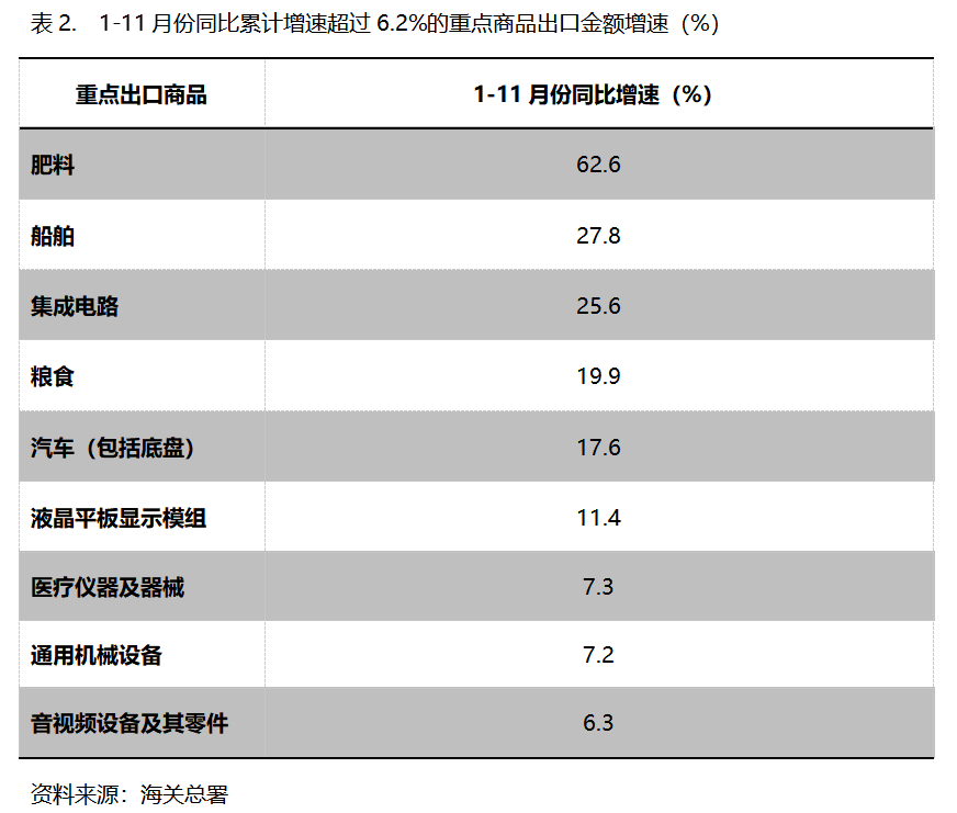 1-11月份,出口金額同比增速超過(guò)6.2%的重點(diǎn)商品共有9類,即肥料出口增長(zhǎng)62.6%,船舶增長(zhǎng)27.8%,集成電路增長(zhǎng)25.6%,糧食增長(zhǎng)19.9%,汽車(包括底盤(pán))增長(zhǎng)17.6%,液晶平板顯示模組增長(zhǎng)11.4%,醫(yī)療儀器及器械增長(zhǎng)7.3%,通用機(jī)器設(shè)備增長(zhǎng)7.2%,音視頻設(shè)備及其零件增長(zhǎng)6.3%。