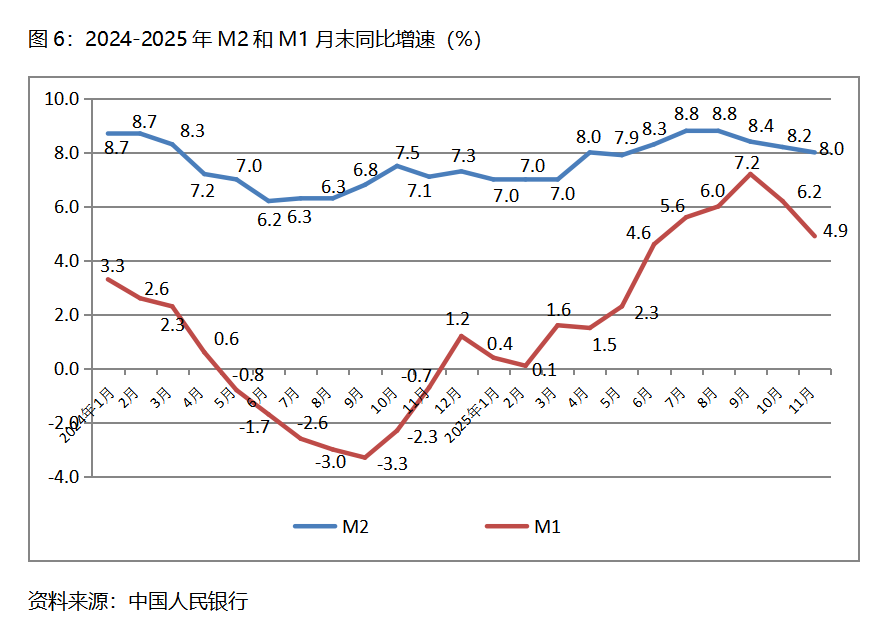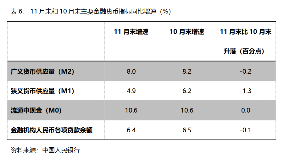 六、M2增速持續(xù)回落。11月末,廣義貨幣供應(yīng)量(M2)同比增長(zhǎng)8.0%,比10月末增長(zhǎng)8.2%回落0.2個(gè)百分點(diǎn),10月末增幅比9月末增長(zhǎng)8.4%回落0.2個(gè)百分點(diǎn);狹義貨幣供應(yīng)量(M1)同比增長(zhǎng)4.9%,比10月末增長(zhǎng)6.2%回落1.3個(gè)百分點(diǎn),10月末增幅比9月末增長(zhǎng)7.2%回落1.0個(gè)百分點(diǎn);流通中貨幣(M0)同比增長(zhǎng)10.6%,與10月末增長(zhǎng)10.6%持平,10月末增幅比9月末增長(zhǎng)11.5%回落0.9個(gè)百分點(diǎn)。11月份末,M2增速已連續(xù)3個(gè)月回落,M1增速已連續(xù)2個(gè)月回落,M0由回落轉(zhuǎn)為持平。