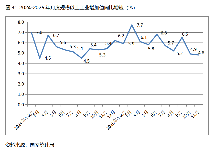 三、工業(yè)增速持續(xù)回落。11月份,規(guī)模以上工業(yè)增加值同比增長(zhǎng)4.8%,比10月份增長(zhǎng)4.9%回落了0.1個(gè)百分點(diǎn),10月份比9月份增長(zhǎng)6.5%回落了1.6個(gè)百分點(diǎn)。從工業(yè)三大門類看,采礦業(yè)增速比上月回升,制造業(yè)和電力、熱力、燃?xì)饧八a(chǎn)和供應(yīng)業(yè)增速回落,11月份,采礦業(yè)同比增長(zhǎng)6.3%,比上月增長(zhǎng)4.5%回升1.8個(gè)百分點(diǎn);制造業(yè)增長(zhǎng)4.6%,比上月增長(zhǎng)4.9%回落0.3個(gè)百分點(diǎn);電力、熱力、燃?xì)饧八a(chǎn)和供應(yīng)業(yè)增長(zhǎng)4.3%,比上月增長(zhǎng)5.4回落1.1個(gè)百分點(diǎn)。
