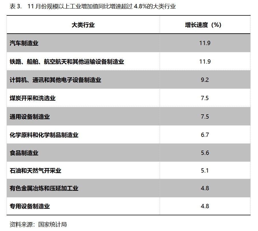 11月份,增長(zhǎng)速度超過(guò)或持平規(guī)模以上工業(yè)增長(zhǎng)4.8%的主要大類行業(yè)共有10個(gè),即汽車制造業(yè)同比增長(zhǎng)11.9%,鐵路、船舶、航空航天和其他運(yùn)輸設(shè)備制造業(yè)增長(zhǎng)11.9%,計(jì)算機(jī)、通訊和其他電子設(shè)備制造業(yè)增長(zhǎng)9.2%,煤炭開(kāi)采和洗選業(yè)增長(zhǎng)7.5%,通用設(shè)備制造業(yè)增長(zhǎng)7.5%,化學(xué)原料和化學(xué)制品制造業(yè)增長(zhǎng)6.7%,食品制造業(yè)增長(zhǎng)5.6%,石油和天然氣開(kāi)采業(yè)增長(zhǎng)5.1%,有色金屬冶煉和壓延加工業(yè)增長(zhǎng)4.8%,專用設(shè)備制造業(yè)增長(zhǎng)4.8%。