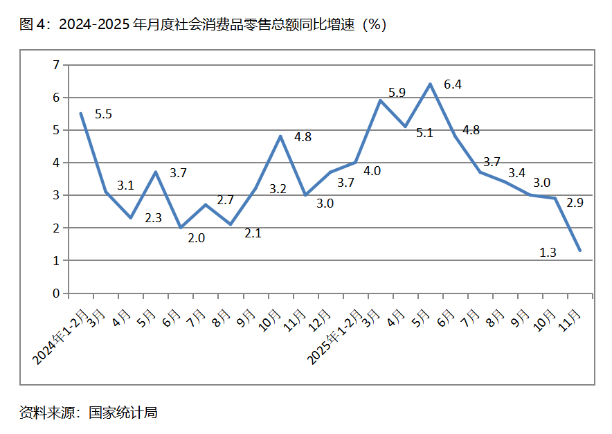 四、零售增速持續(xù)回落。11月份,社會(huì)消費(fèi)品零售總額同比增長(zhǎng)1.3%,比10月份增長(zhǎng)2.9%回落了1.6個(gè)百分點(diǎn),10月份比9月份增長(zhǎng)3.0%回落了0.1個(gè)百分點(diǎn),其中,餐飲收入和商品零售額增速均出現(xiàn)了回落,10月份餐飲收入同比增長(zhǎng)3.2%,比10月份增長(zhǎng)3.8%回落了0.6個(gè)百分點(diǎn);商品零售額增長(zhǎng)1.0%,比10月份增長(zhǎng)2.8%回落1.8個(gè)百分點(diǎn)。社會(huì)消費(fèi)品零售總額增速的持續(xù)回落,需要引起高度關(guān)注。
