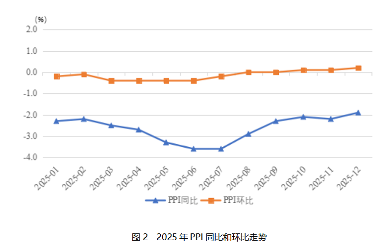 二是PPI呈“V”型走勢,同比繼續(xù)下降。PPI同比下降2.6%,降幅比上年略擴(kuò)大0.4個百分點。生產(chǎn)資料和生活資料價格同步走低,且降幅較上年同期均有所擴(kuò)大。其中,生產(chǎn)資料價格同比下降 3%,降幅較上年擴(kuò)大 0.5 個百分點。從結(jié)構(gòu)上看,生產(chǎn)資料價格變動呈現(xiàn) “上游降幅更深、下游相對較小” 的梯度特征。上游采掘業(yè)價格整體下降9.0%,成為生產(chǎn)資料中降幅最大的品類;中游的原材料工業(yè)價格同比下降3.4%;主要受終端需求不足、產(chǎn)品同質(zhì)化競爭加劇等因素影響,下游的加工工業(yè)價格同比下降2.4%。生活資料中,食品價格下降1.6%,降幅比上年擴(kuò)大0.5個百分點;衣著價格下降0.1%,降幅與上年持平;一般日用品價格上漲0.8%,漲幅比上年擴(kuò)大0.8個百分點;耐用消費品價格下降3.3%,降幅比上年擴(kuò)大1.1個百分點。主要能源行業(yè)價格大幅下降是拖累2025年P(guān)PI走勢的核心因素。其中,煤炭開采和洗選業(yè)價格同比下降15.7%,降幅較上年大幅擴(kuò)大7.5個百分點。原因一是全球煤炭市場供過于求、國際煤炭價格持續(xù)走低,二是國內(nèi)煤炭行業(yè)產(chǎn)能優(yōu)化調(diào)整、清潔能源替代進(jìn)程加快,進(jìn)一步壓低了煤炭價格;石油和天然氣開采業(yè)價格同比下降 9.9%,降幅較上年擴(kuò)大9.5個百分點,主要受國際地緣政治局勢緩和、全球原油產(chǎn)量增加導(dǎo)致的國際油價下行影響,國內(nèi)成品油價格聯(lián)動調(diào)整,進(jìn)而傳導(dǎo)至上游開采環(huán)節(jié)。上述兩大能源行業(yè)的價格深度下行,不僅直接拉低了采掘工業(yè)價格,還通過產(chǎn)業(yè)鏈傳導(dǎo)影響了原材料工業(yè)、加工工業(yè)乃至部分生活資料的成本與價格,成為PPI降幅擴(kuò)大的重要因素。?